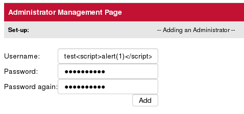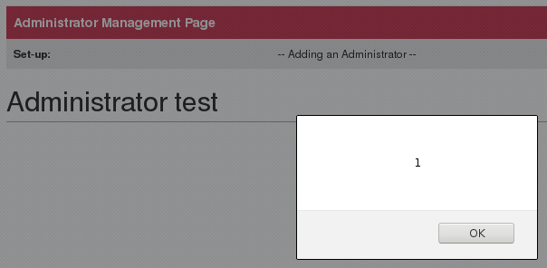 When an admin user is created with a name containing HTML elements like test<script>alert(1)</script>: